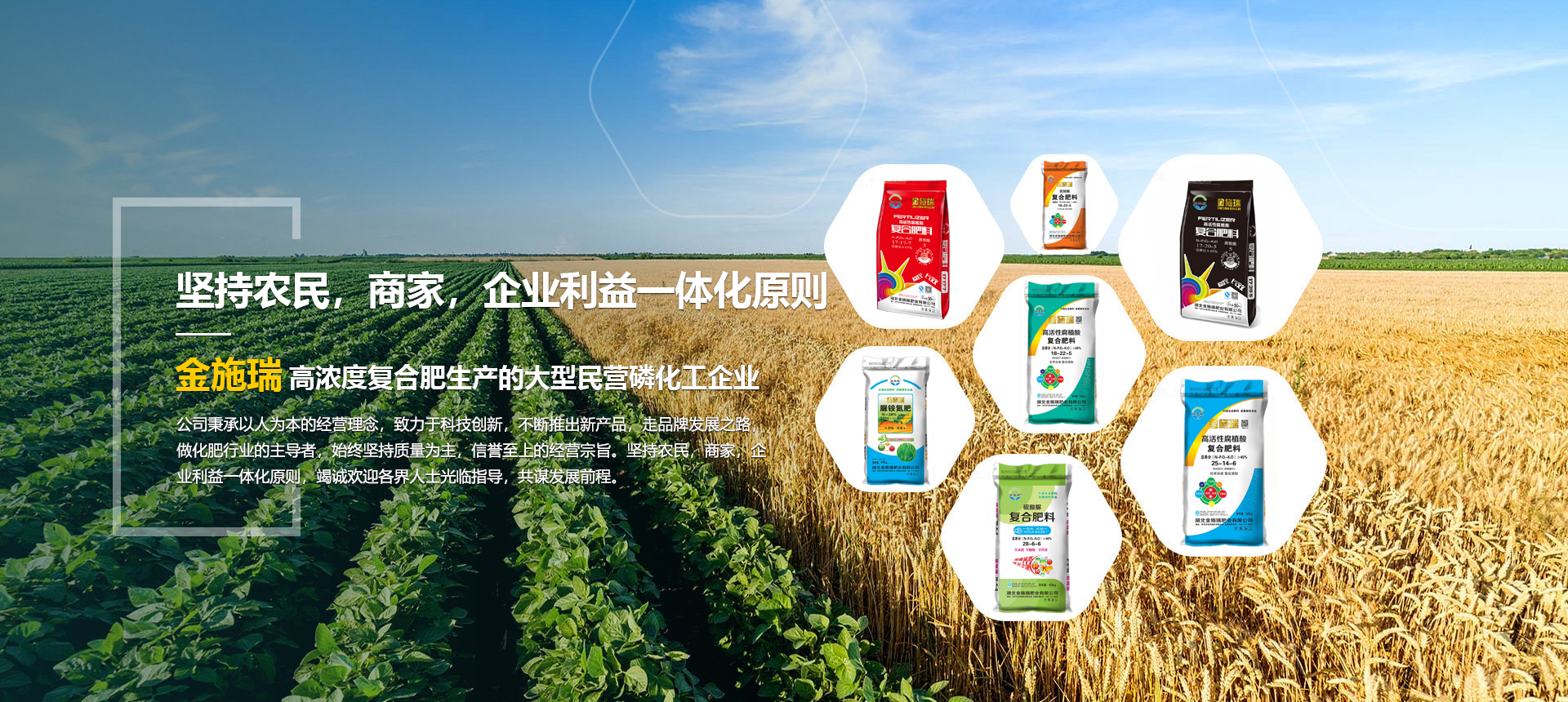 湖北金施瑞肥業(yè)有限公司是一家以生產(chǎn)高濃度復合肥為主導產(chǎn)品的大型民營磷化工企業(yè),在湖北、河南等地均建有大型的現(xiàn)代化生產(chǎn)基地。根據(jù)各地的土壤情況不同由本公司專業(yè)的研發(fā)機構(gòu)專門為各地區(qū)研制不同配方的化肥,真正做到測土配方施肥。